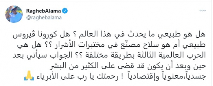 وكتب علامة، عبر حسابه على تويتر: "هل هو طبيعي ما يحدث في هذا العالم؟ هل كورونا ڤيروس طبيعي أم هو سلاح مصنّع في مختبرات الأشرار ؟ هل هي الحرب العالمية الثالثة بطريقة مختلفة ؟ ".