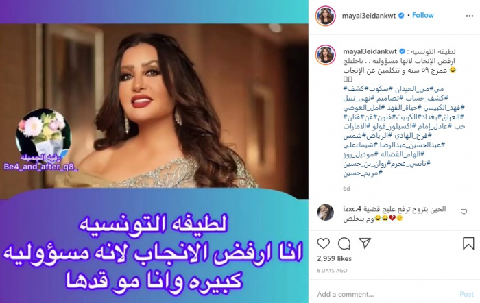 أثارت الإعلامية الكويتية مي العيدان جدلُا بعد تعليقها على تصريحات المطربة التونسية لطيفة عن الإنجاب.