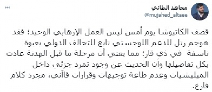 ولفت في تغريدة على حسابه بموقع التدوين المصغر (تويتر)، اليوم إلى أن: "قصف الكاتيوشا يوم أمس ليس العمل الإرهابي الوحيد؛ فقد هوجم رتل للدعم اللوجستي تابع للتحالف الدولي بعبوة ناسفة في ذي قار".