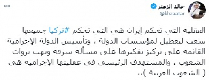 أكد المحلل السياسي السعودي، خالد الزعتر، أن تركيا وإيران دولتان يقودهما نظامان إجراميان، يعملان على سرقة الشعوب العربية.