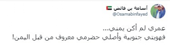 أكد الإعلامي أسامة بن فائض، في تغريدة على حسابه بموقع التدوين المصغر (تويتر)، اليوم أن الأصل الحضرمي يسبق اليمن.