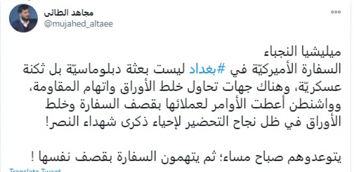 وقال في تغريدة عبر "تويتر" رصدها "المشهد العربي": "مليشيا النجباء السفارة الأمريكيّة في بغداد ليست بعثة دبلوماسيّة بل ثكنة عسكريّة، وهناك جهات تحاول خلط الأوراق واتهام المقاومة، وواشنطن أعطت الأوامر لعملائها بقصف السفارة وخلط الأوراق في ظل نجاح التحضير لإحياء ذكرى شهداء النصر! يتوعدوهم صباح مساء؛ ثم يتهمون السفارة بقصف نفسها".