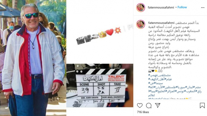 وعلقت: "بدأ النجم مصطفى فهمي تصوير أحدث أعماله الفنية السينمائية فيلم (أهل الكهف)، المأخوذ عن رائعة توفيق الحكيم معالجة درامية وسيناريو وحوار أيمن بهجت قمر وإنتاج وليد منصور ومن إخراج عمرو عرفة".