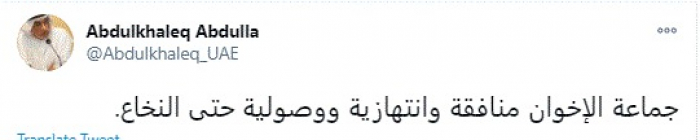 انتقد السياسي والأكاديمي الإماراتي عبدالخالق عبدالله، اليوم، جماعة الإخوان، واصفًا إياها بالجماعة المنافقة والانتهازية.