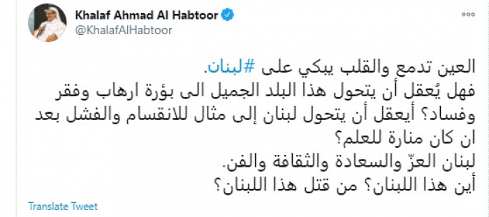 وكتب في تغريدة عبر "تويتر" رصدها "المشهد العربي": "العين تدمع والقلب يبكي على لبنان. فهل يُعقل أن يتحول هذا البلد الجميل إلى بؤرة إرهاب وفقر وفساد؟ أيعقل أن يتحول لبنان إلى مثال للانقسام والفشل بعد أن كان منارة للعلم؟".