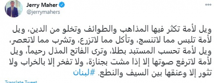وقال في تغريدة عبر "تويتر" رصدها "المشهد العربي": "ويل لأمة تكثر فيها المذاهب والطوائف وتخلو من الدين، ويل لأمة تلبس مما لاتنسج، وتأكل مما لاتزرع، وتشرب مما لاتعصر، ويل لأمة تحسب المستبد بطلا، وترى الفاتح المذل رحيماً، ويل لأمة لاترفع صوتها إلا إذا مشت بجنازة، ولا تفخر إلا بالخراب ولا تثور إلا وعنقها بين السيف والنطع. لبنان".