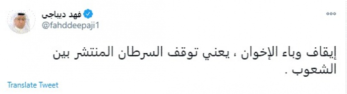 وقال في تغريدة عبر "تويتر" رصدها "المشهد العربي": "إيقاف وباء الإخوان، يعني توقف السرطان المنتشر بين الشعوب".