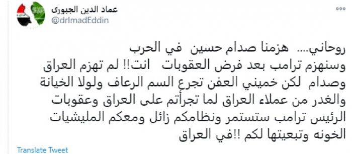 وقال في تغريدة عبر "تويتر" رصدها "المشهد العربي": "روحاني.. هزمنا صدام حسين في الحرب وسنهزم ترامب بعد فرض العقوبات أنت!! لم تهزم العراق وصدام لكن خميني ... تجرع السم الرعاف ولولا الخيانة والغدر من عملاء العراق لما تجرأتم على العراق وعقوبات الرئيس ترامب ستستمر ونظامكم زائل ومعكم المليشيات الخونة وتبعيتها لكم في العراق".