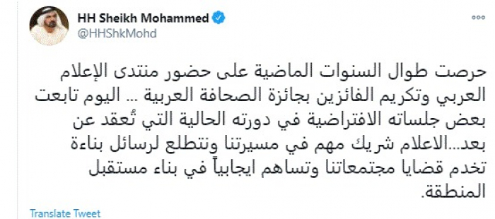 وكتب في تغريدة عبر "تويتر" رصدها "المشهد العربي": "حرصت طوال السنوات الماضية على حضور منتدى الإعلام العربي وتكريم الفائزين بجائزة الصحافة العربية ... اليوم تابعت بعض جلساته الافتراضية في دورته الحالية التي تُعقد عن بعد...الإعلام شريك مهم في مسيرتنا ونتطلع لرسائل بناءة تخدم قضايا مجتمعاتنا وتساهم إيجابياً في بناء مستقبل المنطقة".