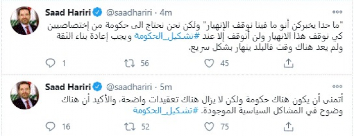 الحريري: نحتاج لحكومة من الاختصاصيين لوقف انهيار لبنان