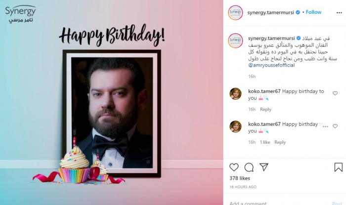 ونشرت "سينرجي" صورة لعمرو يوسف، عبر حسابها الرسمي بموقع "إنستجرام"، وعلّقت: "في عيد ميلاد الفنان الموهوب والمتألق عمرو يوسف، حبينا نحتفل به في اليوم ده ونقوله كل سنة وأنت طيب ومن نجاح لنجاح على طول".