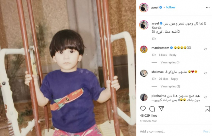 وعلّقت "أسيل"، على الصورة قائلةَ: "لما كان وجهي شعر وعيون بس، ملاحظة أشبه ممثل كوري؟".