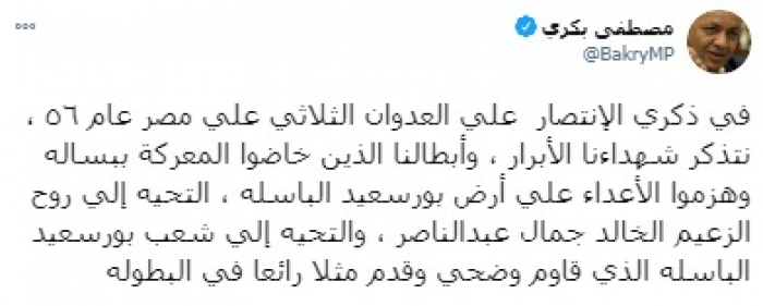 وقال في تغريدة على حسابه بموقع التدوين المصغر (تويتر)، اليوم إنه: "في ذكري الانتصار علي العدوان الثلاثي علي مصر عام 56، نتذكر شهداءنا الأبرار، وأبطالنا الذين خاضوا المعركة ببسالة وهزموا الأعداء علي أرض بورسعيد الباسلة".