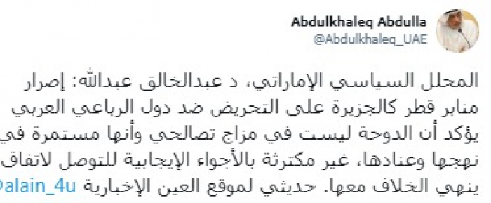 رأى المحلل السياسي الإماراتي، الدكتور عبدالخالق عبدالله، أن إصرار منابر قطر الإعلامية على التحريض على دول الرباعي العربي، يؤشر على أن عدم رغبة قطر في المصالحة.