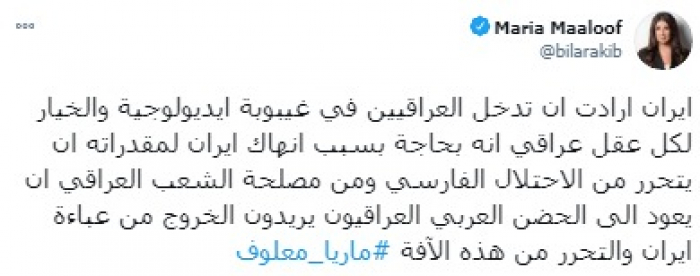 شددت الإعلامية اللبنانية ماريا معلوف على أن تحرر العراق من الاحتلال الفارسي مصلحة لشعبه وعودة إلى الحضن العربي.