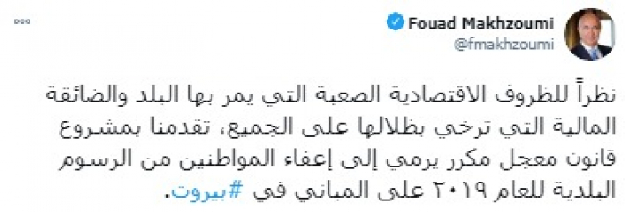 وقال في تغريدة على حسابه بموقع التدوين المصغر (تويتر)، اليوم إنه: "نظرًا للظروف الاقتصادية الصعبة التي يمر بها البلد والضائقة المالية التي ترخي بظلالها على الجميع، تقدمنا بمشروع قانون معجل مكرر يرمي إلى إعفاء المواطنين من الرسوم البلدية للعام ٢٠١٩ على المباني في بيروت.