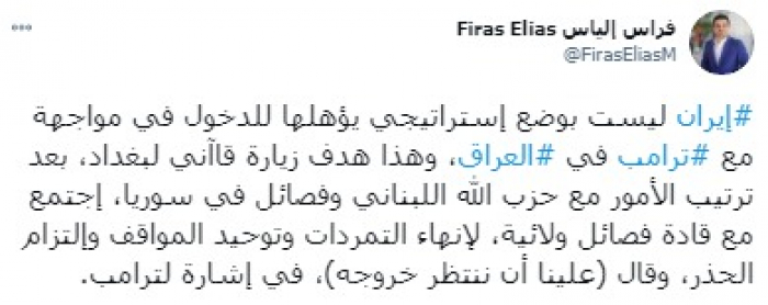 وقال في تغريدة على حسابه بموقع التدوين المصغر تويتر، اليوم إن: "إيران ليست بوضع استراتيجي يؤهلها للدخول في مواجهة مع ترامب في العراق، وهذا هدف زيارة قاآني لبغداد".