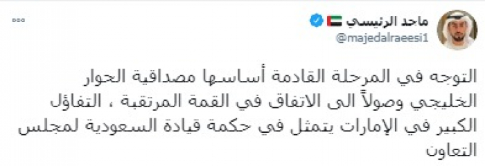 وشدد في تغريدة على حسابه بموقع التدوين المصغر تويتر، اليوم على أن: "التوجه في المرحلة القادمة أساسه مصداقية الحوار الخليجي وصولًا إلى الاتفاق في القمة المرتقبة".