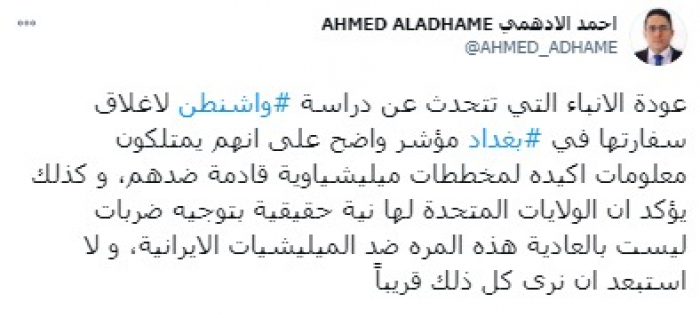 وقال في تغريدة على حسابه بموقع التدوين المصغر تويتر، اليوم إن: "عودة الأنباء التي تتحدث عن دراسة واشنطن لإغلاق سفارتها في بغداد مؤشر واضح على أنهم يمتلكون معلومات أكيدة لمخططات ميليشياوية قادمة ضدهم".