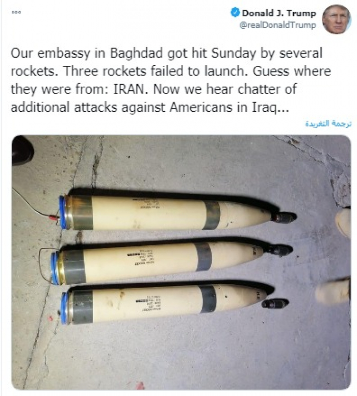 وقال في التغريدة: "تعرضت سفارتنا في بغداد يوم الاحد بعدة صواريخ. ثلاثة صواريخ لم تنطلق".