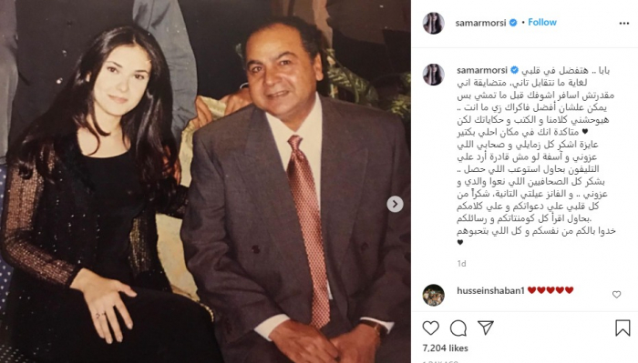 ونشرت "سمر" صورا تجمعها بوالدها عبر حسابها بموقع "إنستجرام"، معلقةً: "بابا.. هتفضل في قلبي لغاية ما نتقابل تاني، متضايقة إني مقدرتش أسافر أشوفك قبل ما تمشي بس يمكن علشان أفضل فاكراك زي ما أنت.. هيوحشني كلامنا والكتب وحكاياتك لكن متأكدة إنك في مكان أحلى بكتير".