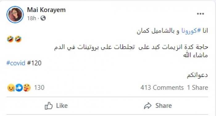 وكتبت "مي": "أنا كورونا وبالبشاميل كمان، حاجة كده إنزيمات كبد على تجلطات في بروتينات الدم، ما شاء الله".