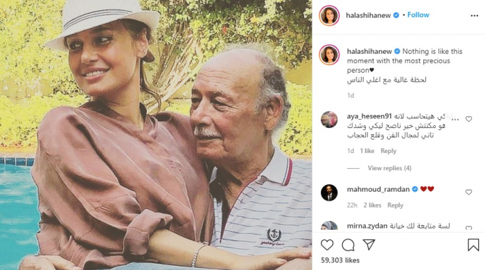 وظهرت "حلا" في الصورة وهي جالسة رفقة والدها الفنان التشكيلي أحمد شيحة، وعلّقت: "لحظة غالية مع أغلى الناس".