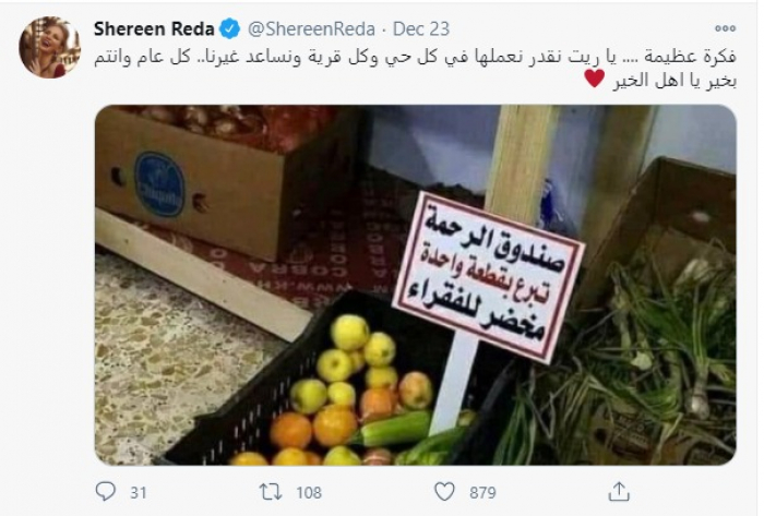 وغردت "شيرين"، عبر حسابها بموقع "تويتر"، حول الأمر قائلة: "فكرة عظيمة، ياريت نقدر نعملها في كل حي وكل قرية ونساعد غيرنا، كل عام وأنتم بخير يا أهل الخير".
