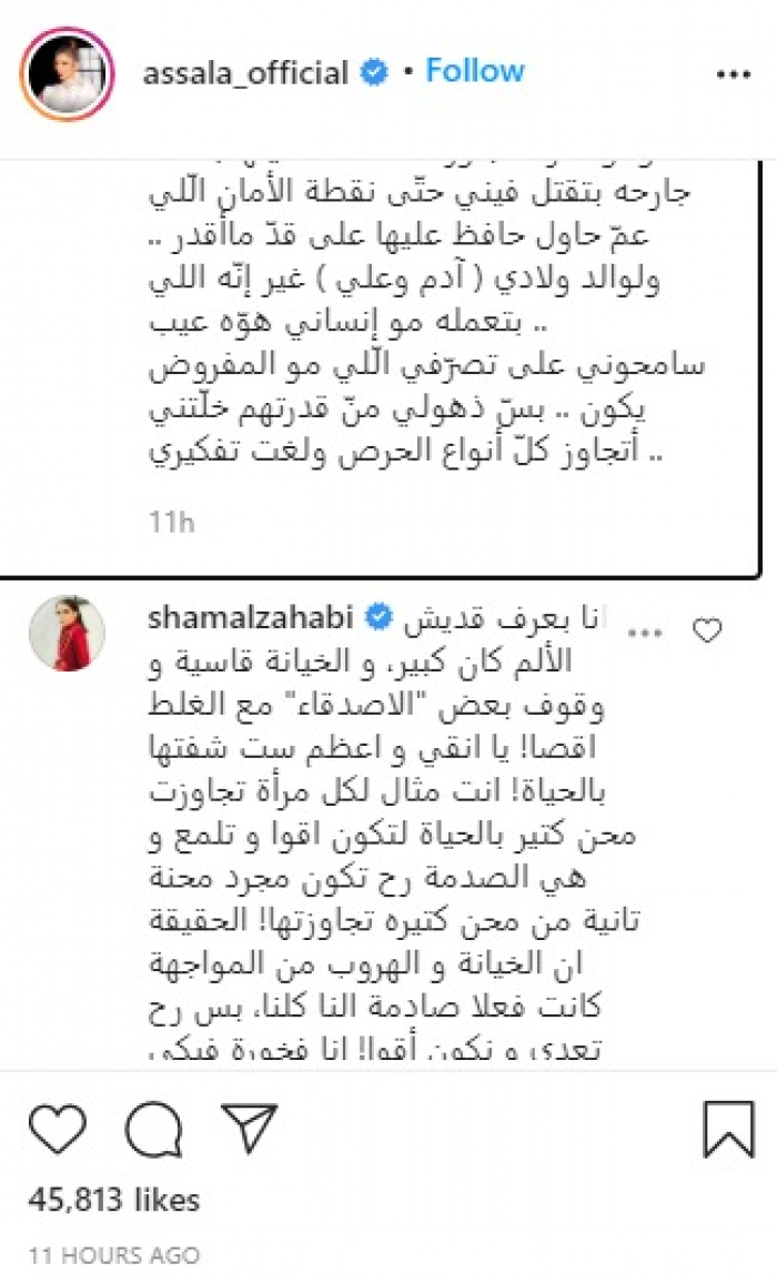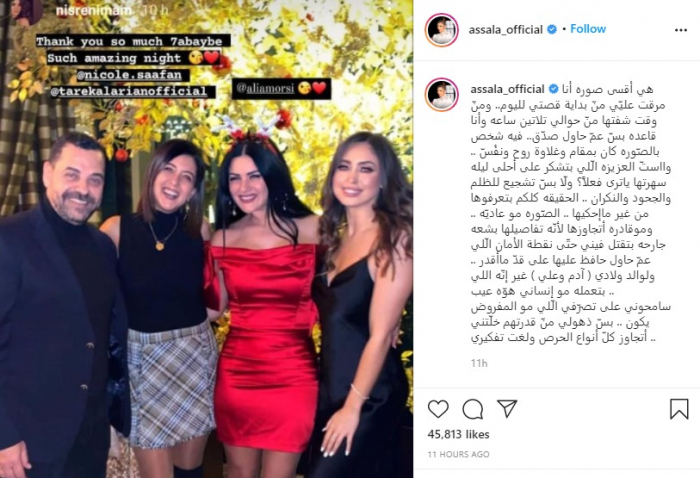 وتابعت: "الستّ العزيزة الّلي بتشكر على أحلى ليلة سهرتها ياترى فعلاً؟ ولّا بسّ تشجيع للظلم والجحود والنكران، الحقيقة كلكم بتعرفوها من غير ما إحكيها، الصّوره مو عاديّة، ومو قادرة أتجاوزها لأنّه تفاصيلها بشعة جارحة بتقتل فيني حتّى نقطة الأمان الّلي عمّ حاول حافظ عليها على قدّ ما أقدر .. ولوالد ولادي ( آدم وعلي ) غير إنّه اللي بتعمله مو إنساني هوّه عيب".
