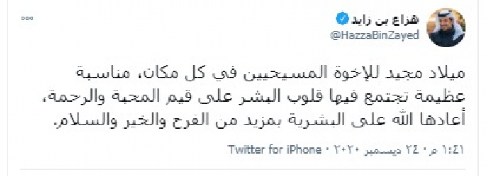 وكتب "هزاع بن زايد" تغريدة عبر حسابه الرسمي بتويتر، رصدها "المشهد العربي" قال فيها: "ميلاد مجيد للإخوة المسيحيين في كل مكان".