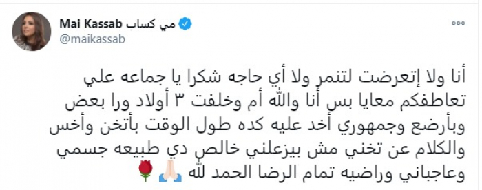 وكتبت كساب، عبر حسابها الرسمي على تويتر: "أنا ولا اتعرضت لتنمر ولا أي حاجة .. شكرًا يا جماعة على تعاطفكم معايا، بس أنا والله أم وخلفت 3 أولاد ورا بعض وبرضع وجمهوري أخد عليا كدة ".
