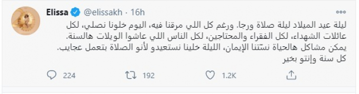 وقالت إليسا فى تغريدة عبر حسابها الرسمى بتويتر :"نحن جميعًا نستعد لعيد الميلاد ولكن لا يسعنى إلا التفكير فى عدم قدرة الجميع على الاحتفال هذا العام، أهالى الشهداء، والذين فقدوا بيوتهم ومستقبلهم، انضموا إلى في الصلاة لهم".