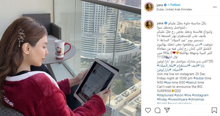 وكتبت عبر حسابها بـ "انستجرام" : " بكل مناسبة حلوة بطلّ عليكم لنتواصل ونحتفل سوا، ولنودّع هالسنة ونعيّد بعض رح طلّ عليكم بلايف على الإنستجرام نهار الجمعة ٢٥ ديسمبر يوم "عيد الميلاد" الساعة ١٠ بتوقيت دبى، وتطلعوا معي لنعيّد بهاليوم المُميّز اللي كمان رح إعلن فيه عن مفاجأة كتير كبيرة ومهمّة بهالليلة يلااااا مين قال انا".
