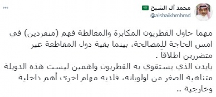 وشدد في تغريدة على حسابه بموقع التدوين المصغر تويتر، على أن: "مهما حاول القطريون المكابرة والمغالطة فهم (منفردين) في أمس الحاجة للمصالحة".