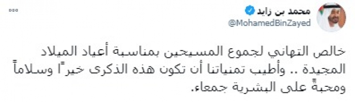 وجه ولي عهد أبو ظبي الشيخ محمد بن زايد، التهنئة إلى المسيحين بمناسبة أعياد الميلاد المجيدة.