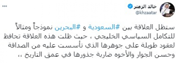 وصف المحلل السياسي السعودي خالد الزعتر، العلاقة بين المملكة العربية السعودية ومملكة البحرين، بأنها مثالًا للتكامل السياسي الخليجي.