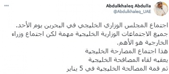 وقال في تغريدة على حسابه بموقع التدوين المصغر تويتر، اليوم إن: "اجتماع المجلس الوزاري الخليجي في البحرين يوم الأحد".