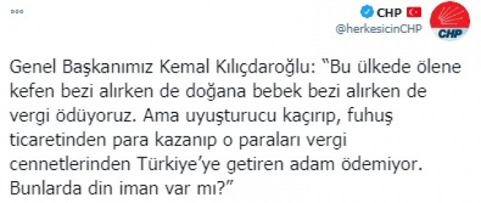 ونشر الحساب الرسمي للحزب على تويتر، جانبا من تصريحات كيليجدار التي قال فيها: "في هذا البلد، ندفع الضرائب عند شراء أكفان للمتوفى".