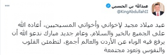 توجه عاهل الأردن، الملك عبدالله بن الحسين بالتهنئة إلى المسيحين بمناسبة أعياد الميلاد، متطلعا إلى زوال وباء كورونا من العالم.