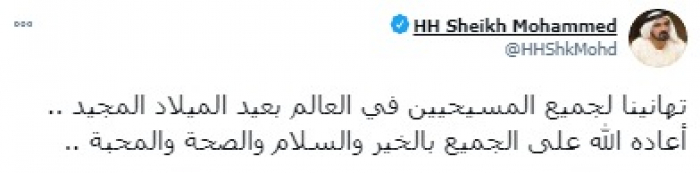 هنأ رئيس وزراء الإمارات، حاكم دبي، الشيخ محمد بن راشد، جميع المسيحيين في العالم بعيد الميلاد.