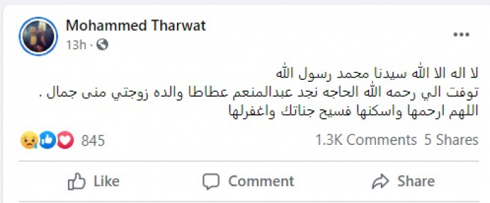 وكتب "ثروت": "لا إله إلا الله سيدنا محمد رسول الله، توفيت إلى رحمة الله الحاجة نجد عبد المنعم عطاطا والدة زوجتي منى جمال، اللهم ارحمها واسكنها فسيح جناتك وأغفر لها".