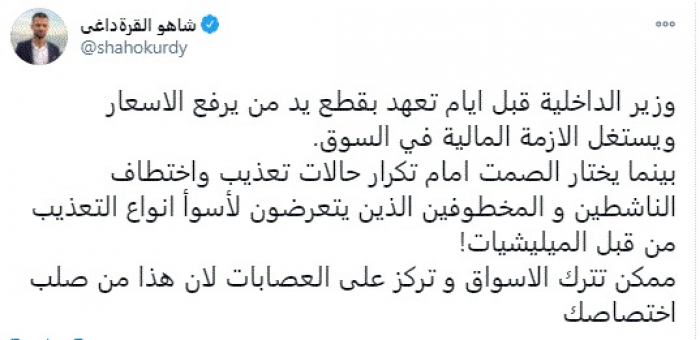 استنكر الكاتب الصحفي العراقي شاهو القرةداغي، اليوم، صمت الحكومة العراقية على حالات تعذيب واختطاف المليشيات الإيرانية للناشطين العراقيين.