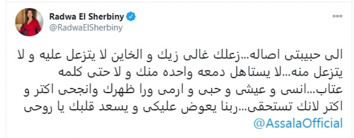 وكتبت رضوى الشربيني عبر حسابها بموقع تويتر قائلة: "إلى حبيبتى اصاله...زعلك غالى زيك والخاين لا يتزعل عليه ولا يتزعل منه... لا يستاهل دمعه واحده منك ولا حتى كلمه عتاب... انسى وعيشى وحبى وارمى ورا ظهرك وانجحى اكتر واكتر لانك تستحقى... ربنا يعوض عليكى ويسعد قلبك يا روحى".