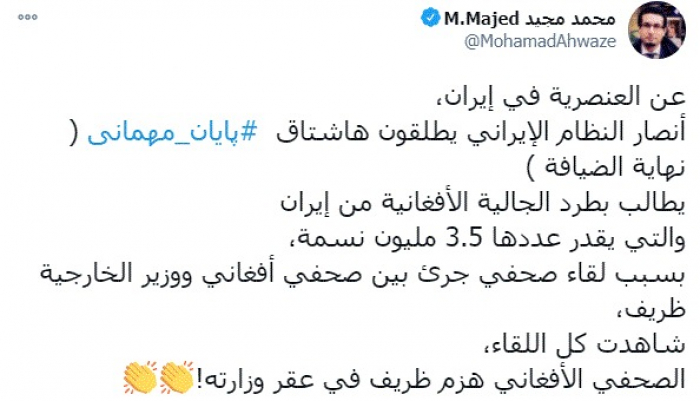 وقال في تغريدة عبر "تويتر" رصدها "المشهد العربي": "عن العنصرية في إيران، أنصار النظام الإيراني يطلقون هاشتاق پایان مهمانی (نهاية الضيافة) يطالب بطرد الجالية الأفغانية من إيران والتي يقدر عددها 3.5 مليون نسمة، بسبب لقاء صحفي جرئ بين صحفي أفغاني ووزير الخارجية ظريف، شاهدت كل اللقاء، الصحفي الأفغاني هزم ظريف في عقر وزارته".