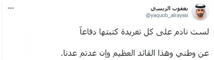وقال في تغريدة عبر "تويتر" رصدها "المشهد العربي": "لست نادم على كل تغريدة كتبتها دفاعاً عن وطني وهذا القائد العظيم وإن عدتم عدنا".