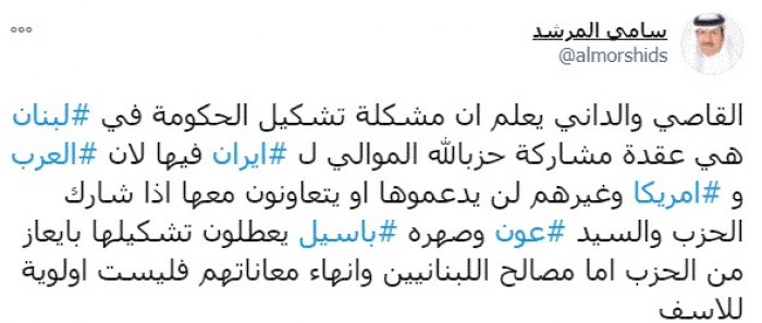 وكتب في تغريدة عبر "تويتر" رصدها "المشهد العربي": "القاصي والداني يعلم أن مشكلة تشكيل الحكومة في لبنان هي عقدة مشاركة حزبالله الموالي لإيران فيها لأن العرب وأمريكا وغيرهم لن يدعموها أو يتعاونون معها إذا شارك الحزب والسيد عون وصهره باسيل يعطلون تشكيلها بايعاز من الحزب أما مصالح اللبنانيين وإنهاء معاناتهم فليست أولوية للأسف".
