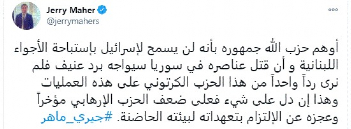 وكتب في تغريدة عبر "تويتر" رصدها "المشهد العربي": "أوهم حزب الله جمهوره بأنه لن يسمح لإسرائيل بإستباحة الأجواء اللبنانية وأن قتل عناصره في سوريا سيواجه برد عنيف فلم نرى رداً واحداً من هذا الحزب الكرتوني على هذه العمليات وهذا إن دل على شيء فعلى ضعف الحزب الإرهابي مؤخراً وعجزه عن الإلتزام بتعهداته لبيئته الحاضنة".