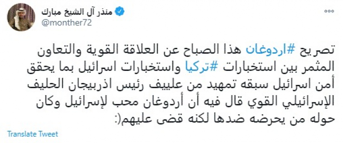 قال المدون السعودي البارز منذر آل الشيخ مبارك، اليوم، إن تصريح الرئيس التركي رجب طيب أردوغان بشأن علاقة بلاده مع إسرائيل، أثبت الكثير من التعاون بين البلدين.