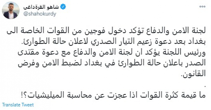 وقال في تغريدة عبر "تويتر" رصدها "المشهد العربي": "لجنة الأمن والدفاع تؤكد دخول فوجين من القوات الخاصة إلى بغداد بعد دعوة زعيم التيار الصدري لإعلان حالة الطوارئ. ورئيس اللجنة يؤكد أن لجنة الأمن والدفاع مع دعوة مقتدى الصدر بإعلان حالة الطوارئ في بغداد لضبط الامن وفرض القانون. ما قيمة كثرة القوات إذا عجزت عن محاسبة المليشيات؟".