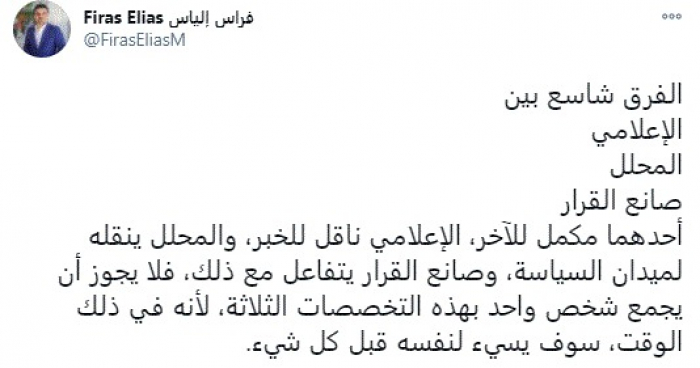 وقال في تغريدة عبر "تويتر" رصدها "المشهد العربي": "الفرق شاسع بين الإعلامي والمحلل وصانع القرار أحدهما مكمل للآخر، الإعلامي ناقل للخبر، والمحلل ينقله لميدان السياسة، وصانع القرار يتفاعل مع ذلك، فلا يجوز أن يجمع شخص واحد بهذه التخصصات الثلاثة، لأنه في ذلك الوقت، سوف يسيء لنفسه قبل كل شيء".